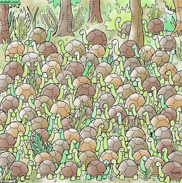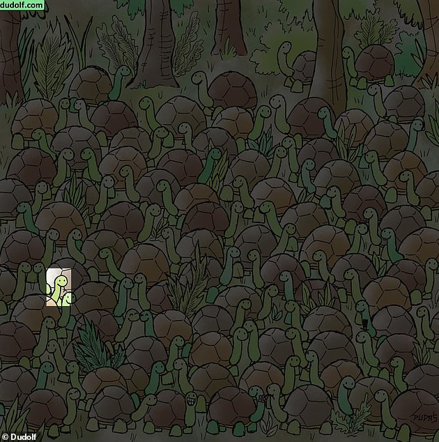 The “find the missing object” puzzle is first shared on Dudolf’s website, and it shows a lot of turtles in a forest with their green necks and heads poking out of their shells. BUT one of the green heads actually belongs to a snake!