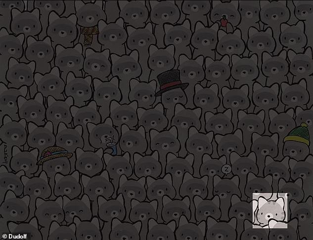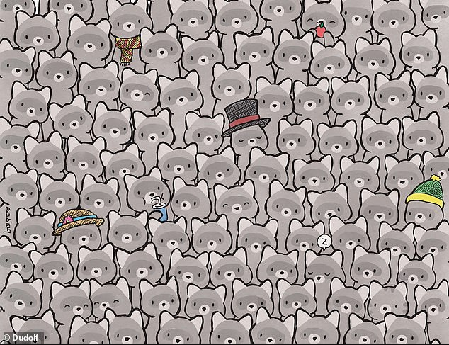 The brainteaser shows the identical raccoons having a good time, with some snacking while others are wearing cute hats — BUT there is one animal that doesn’t belong to the group.
