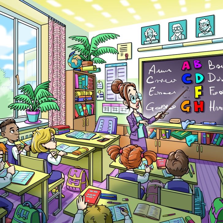 In the second picture puzzle for the day, you can see a confused teacher pointing at the blackboard. It appears that the letter ‘E’ is missing! Help her find it before the students lose focus.