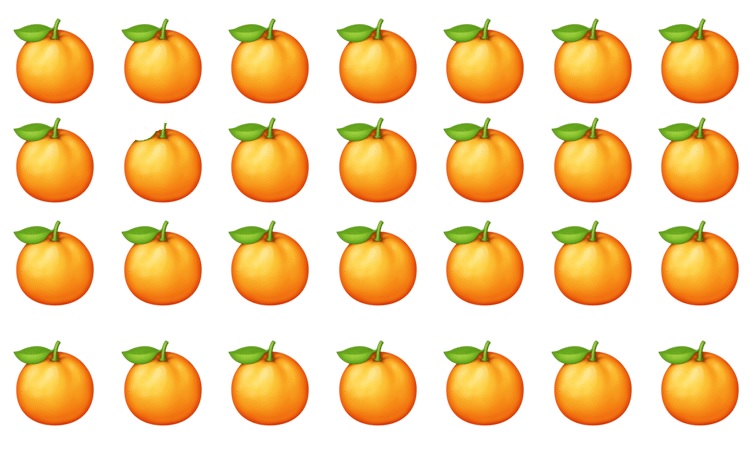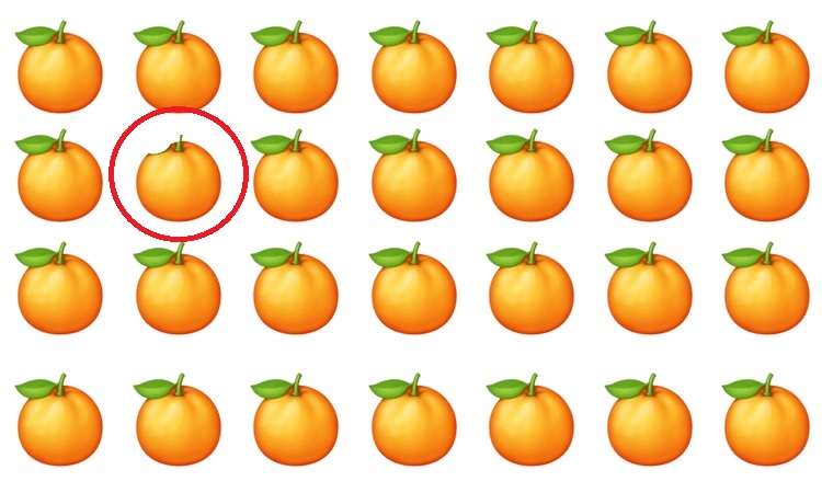 As you can see in the picture below, the odd one out is the second orange from the left of the second row. It is missing a leaf!