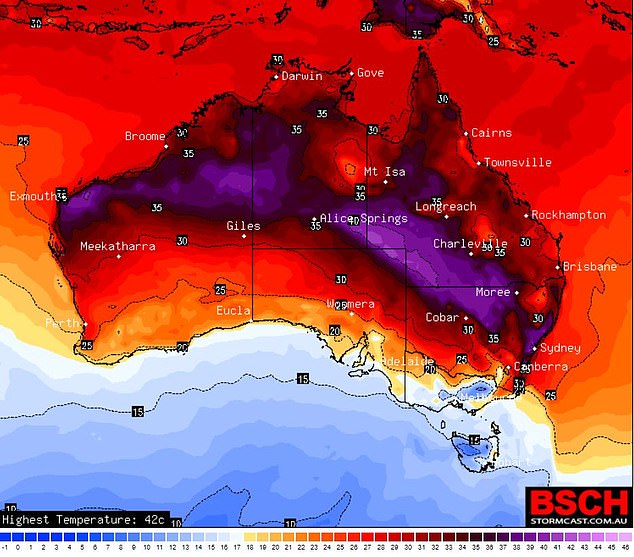 According to reports released by weather authorities, temperatures in Australia are set to reach 40C in Nowra on the South Coast, 41C in Cessnock in the Hunter region, 42C in Bulahdelah on the mid-north coast, and 43C in Penrith in western Sydney.