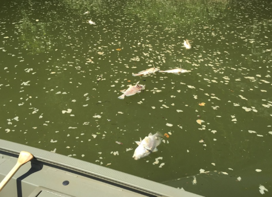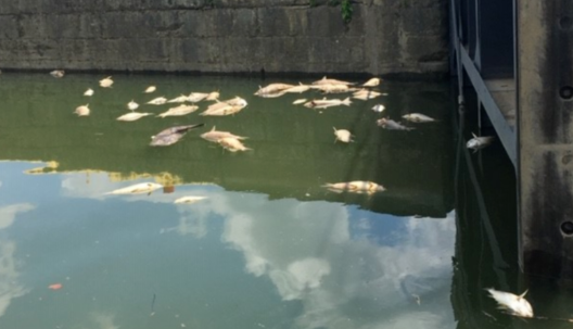 The dead fishes are floating on the surface of the water and are gradually pilling up on the river bank.