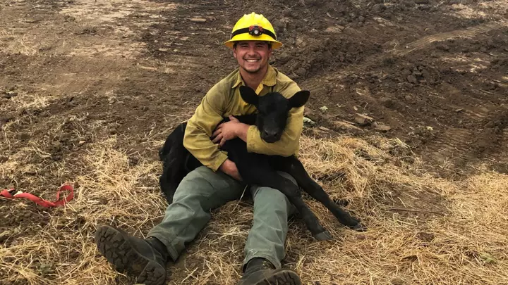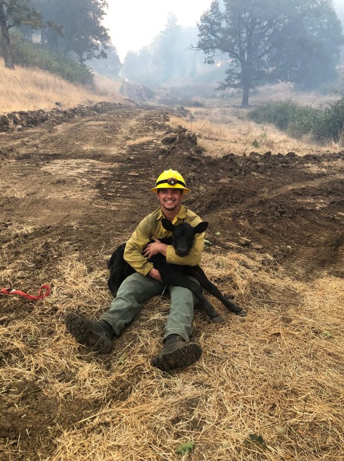 “While our crews were working on the fire, five cows and this calf were in a bad spot with fire advancing their way. In the chaos of the moment, this little guy got stuck in a patch of blackberries that were on fire!