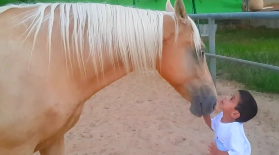 In this short video, you will see the incredible bond develop between the little boy and the giant horse. The animal becomes instantly attentive to the movements of the child and allows the little one to cuddle beside him.