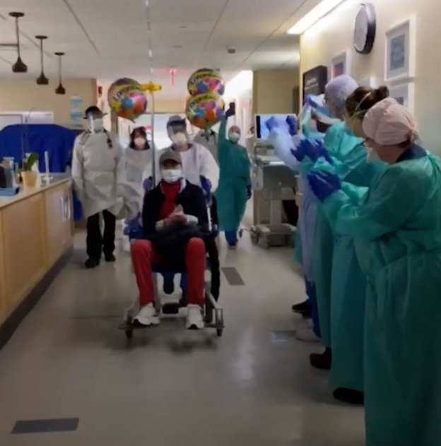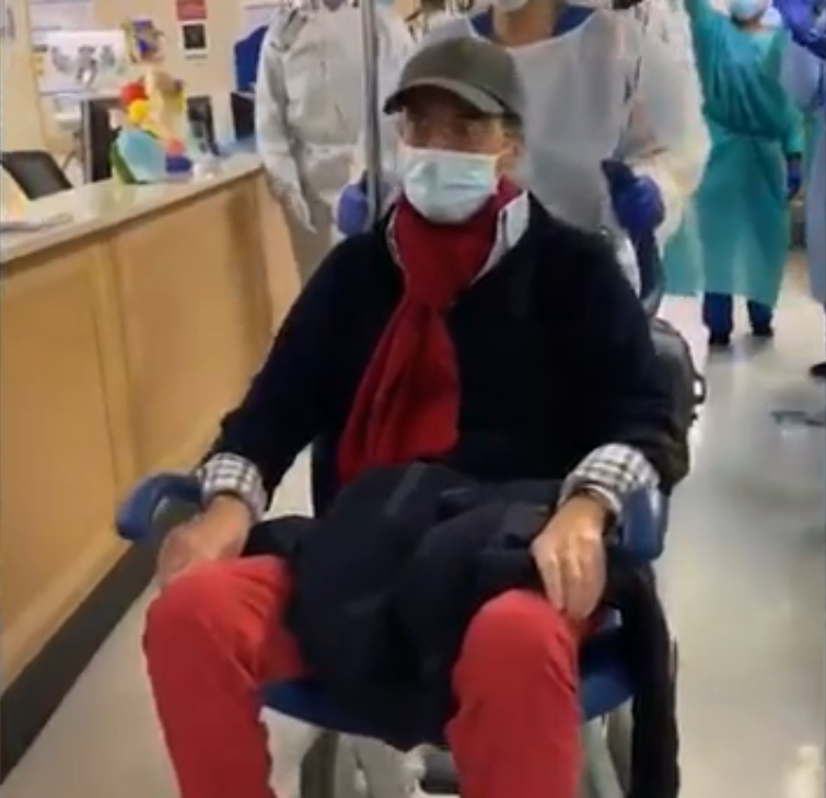 The hospital staff was seen cheering him up and clapping for him in the hallways of the healthcare facility as he passed by them.