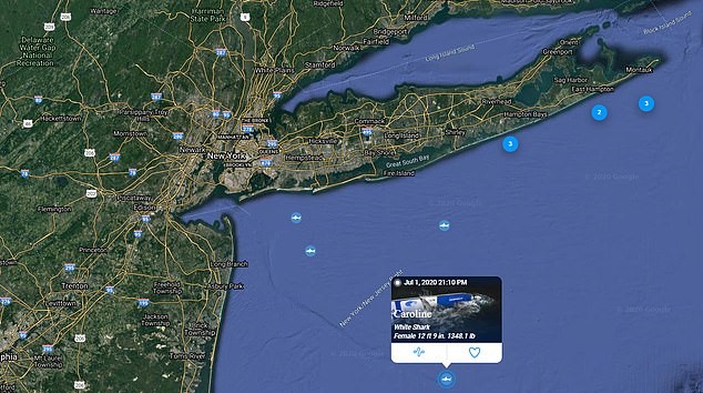 The most recent sightings are Caper, who measures 8ft with and weighs 348lbs, Cabot at 9ft weighing 533lbs, and Caroline at 12 feet 9in and 1,348lbs, according to the Ocearch online shark tracker.