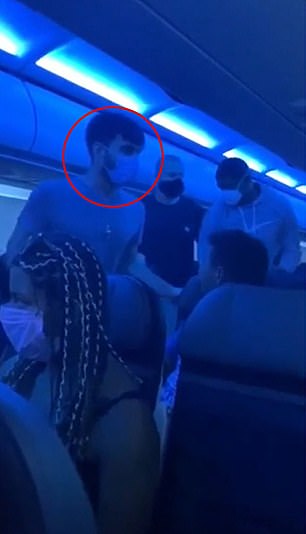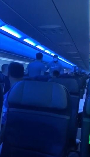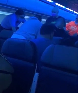Footage filmed by another passenger shows the two trying to take the suspect down as a flight crew arrives with ties to restrain his hands.