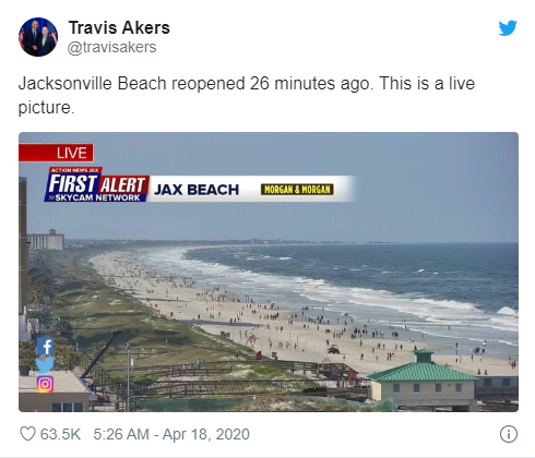“This can be the beginning of the pathway back to normal life. Please respect and follow these limitations. Stay within the guidelines for your safety as well as for the safety of your neighbours,” said Jacksonville Mayor Lenny Curry.