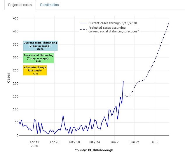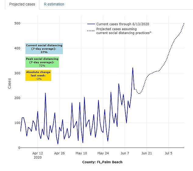 Meanwhile, daily confirmed COVID-19 cases are predicted to reach nearly 500 in Hillsborough and 500 in Palm Beach by mid-July.
