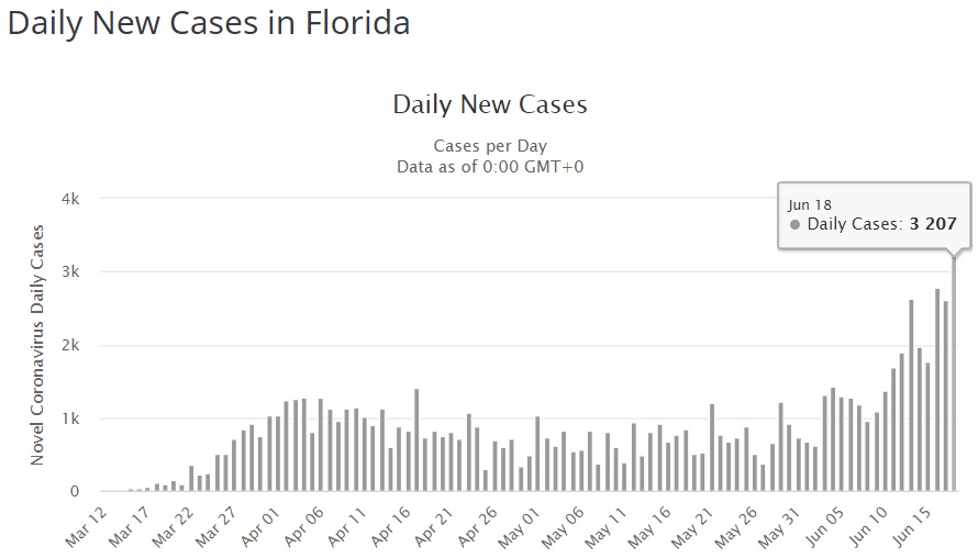 As of Thursday, June 18, the Sunshine State has recorded 3,207 new daily COVID-19 cases and surpassed all previous records in the state.