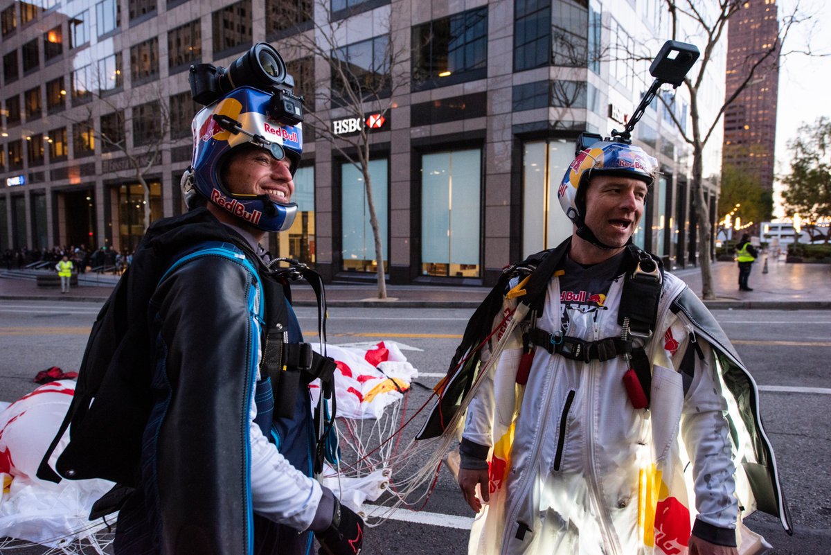 “Wearing wingsuits that shape the human body into an airfoil, they leaped from a helicopter 4,000 feet above LA and swooped into downtown at more than 120 mph,”