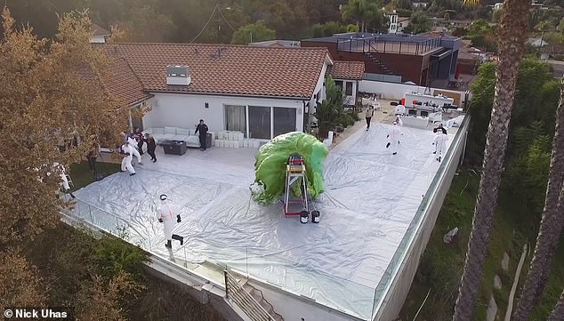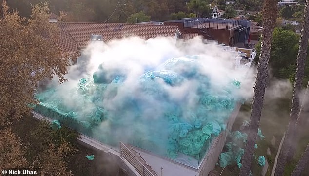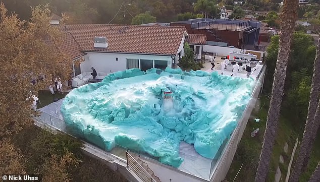 In the footage, Uhas explained the science behind his experiment, with 200 cubic meters of foam spilling over in the backyard of his home in California.