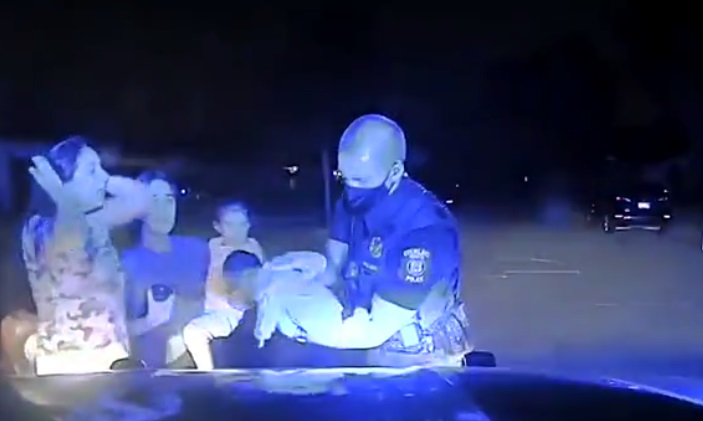 Holding the baby in his hands, the officer said: “Okay, calm down, calm down. Let me see the baby.”