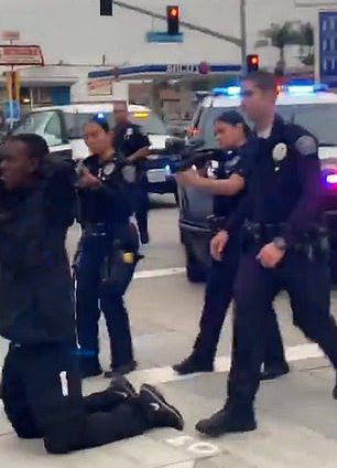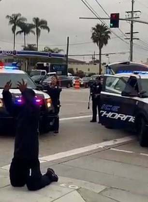 After a moment, an upset bystander rushed to the scene and confronted the cops who surrounded the man at a gas station in Hawthorne, Los Angeles, California.