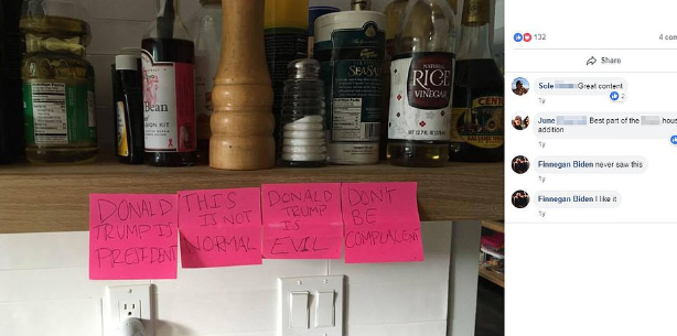 The cover photo of the Facebook page contains four attached pink notes in a row that demonstrates President Trump getting as evil and him getting elected isn’t normal.