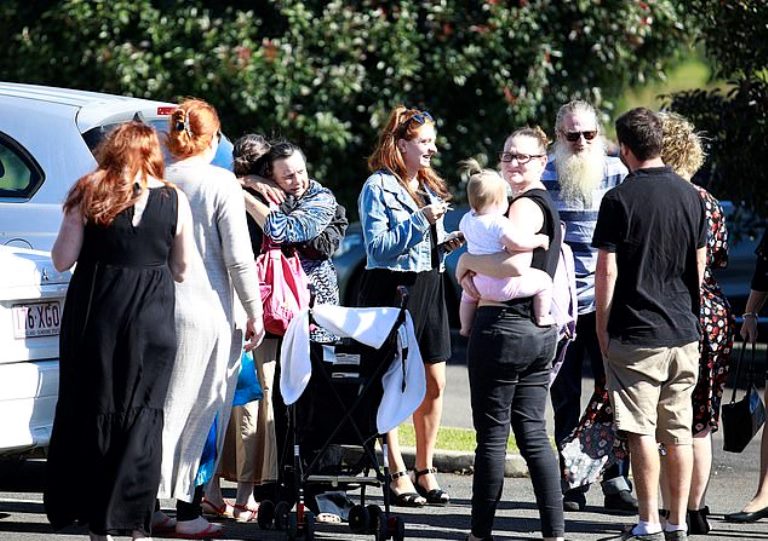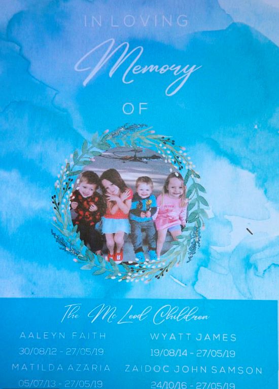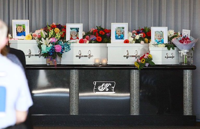Small white coffins carrying the bodies of the children, 2-year-old Zaidok, 4-year-old Wyatt, 5-year-old Matilda, and 6-year-old Aelyn, were topped with their photos during the service. Hundreds of mourners attended the service at Urraween Crematorium.