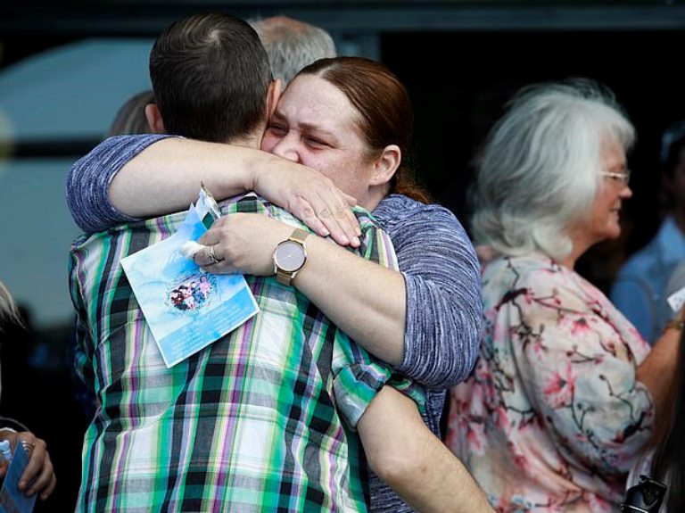 The father spent time alone with his children’s coffins before the funeral started. A separate service was to be held for the mother.