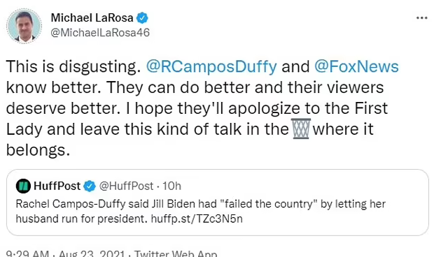 Jill Biden’s press secretary Michael La Rosa took to Twitter and wrote: “This is disgusting. @RCampusDuffy and @FoxNews know better. They can do better and their viewers deserve better.