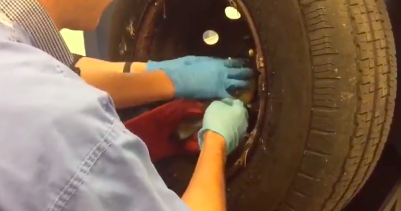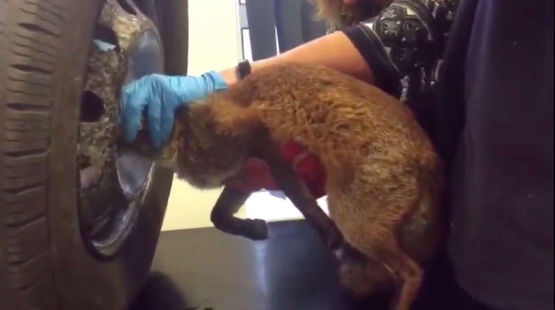A fox was stuck underneath the tyre of a car and did not how to get out of the situation.