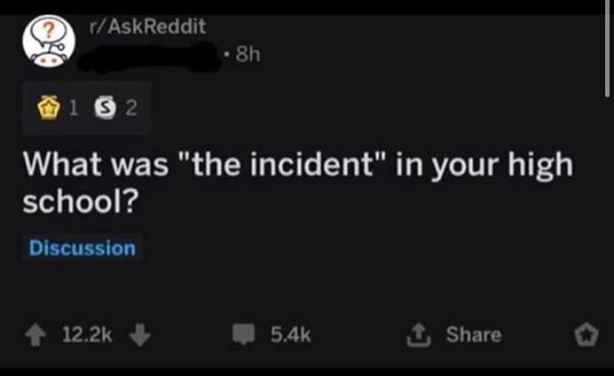 ‘’The entire school was warned off looking for more access points. Told of the danger of the tunnels and that anyone caught down there would be suspended perminately. So yeah. That was “the incident” in my high school.’’