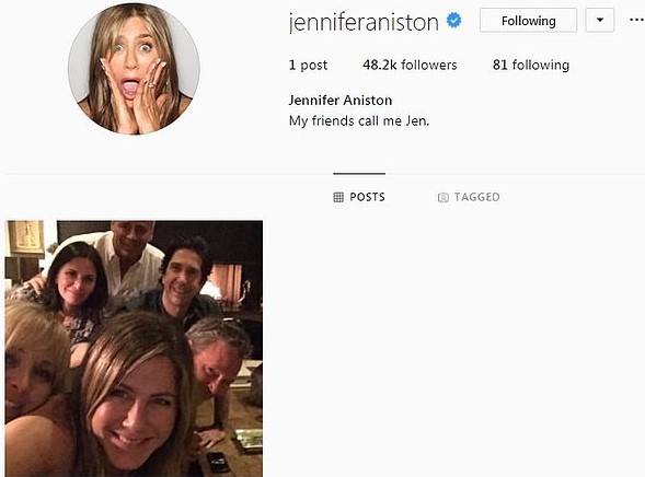 All six friends were seen beaming in the picture Jennifer Aniston shared in her first-ever Instagram post.