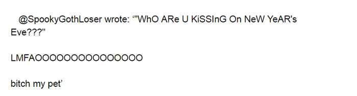 1 @SpookyGothLoser wrote: ‘”WhO ARe U KiSSInG On NeW YeAR’s Eve???”