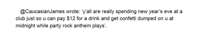 3 @CaucasianJames wrote: ‘y’all are really spending new year’s eve at a club just so u can pay $12 for a drink and get confetti dumped on u at midnight while party rock anthem plays’.