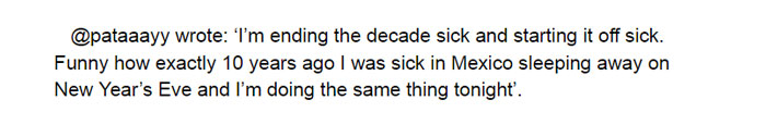 6 @pataaayy wrote: ‘I’m ending the decade sick and starting it off sick. Funny how exactly 10 years ago I was sick in Mexico sleeping away on New Year’s Eve and I’m doing the same thing tonight’.