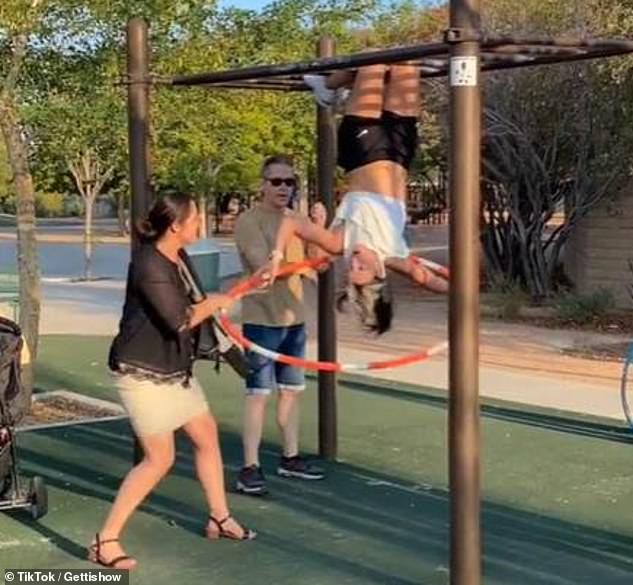All the woman did was furiously point towards her top that had slid down while she used the monkey bars to showcase her talent and have some fun.