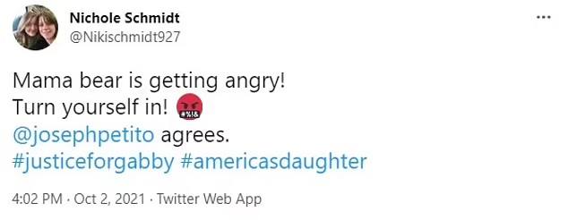 “Mama bear is getting angry! Turn yourself in! 🤬 @josephpetito agrees. #justiceforgabby #americasdaughter,” Schmidt tweeted shortly after creating her Twitter account.