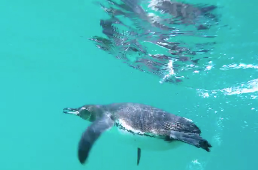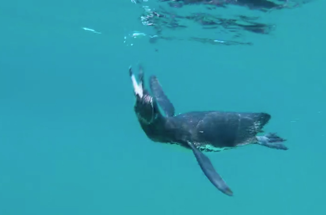 This penguin is not hunting for food and just checking out the swimmer. The curious little fellow made a beeline for him and looked at him from above and below the surface.