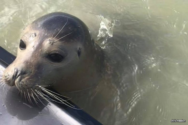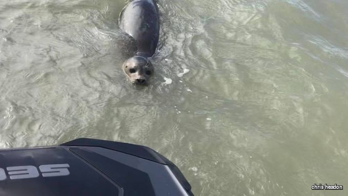 A member of Littlehampton Jet Ski Club, Chris Headon was hanging out with a friend at the harbour entrance when a friendly seal came to greet them in Littlehampton Harbour.