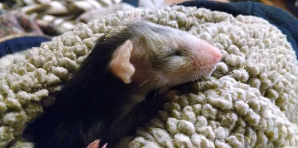 Poncho, the baby opossum, was found clinging on his mother when she died and as Hantu didn’t have any pups, it was easy for her to adopt the baby opossum. Hantu is playing the role of protecting Poncho, just like his mother would have done.