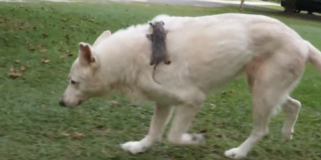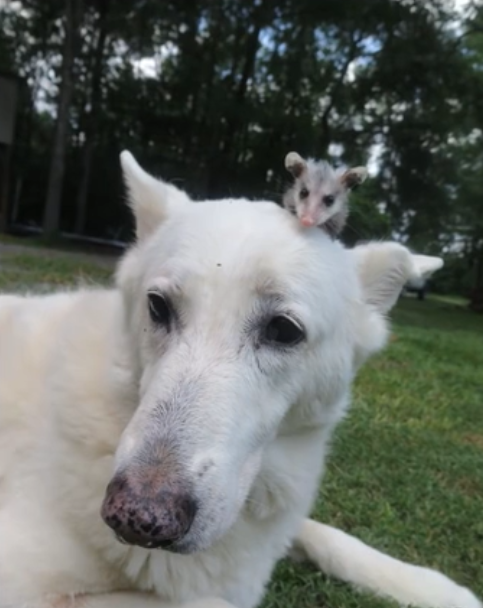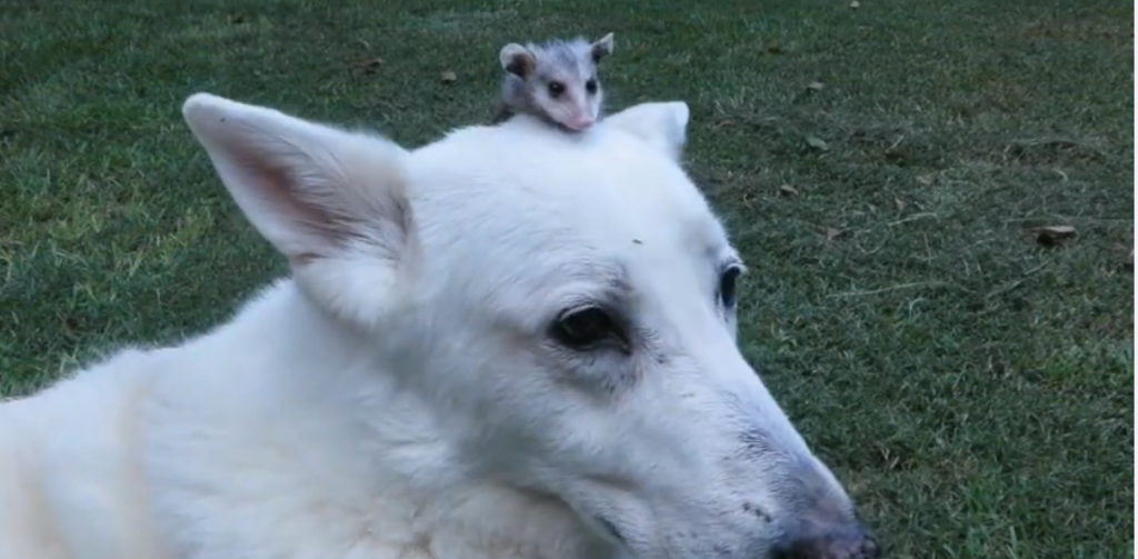 Thankfully the baby didn’t have to survive alone as the White German Shepherd, Hantu adopted him. Hantu embraced the baby opossum as it’s own and took care of it just like the mother would have done.