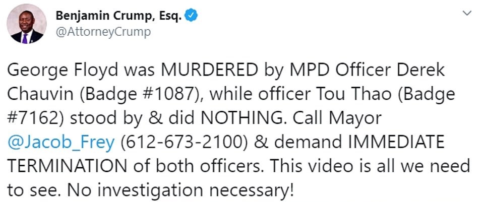 According to the family’s attorney, Benjamin Crump, officer Chauvin needs to be charged with murder whereas he called for the cop’s partners to be charged as murder accomplices.