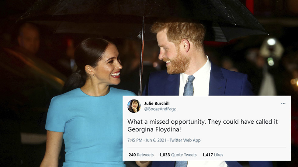 “Harry and Meghan might as well name their newborn daughter Georgina Floydina,” Julie exclaimed on Twitter.