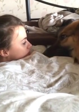 Just like humans can talk to their dogs about anything in the world, this stressed-out German Shepherd is doing the same with her owner.