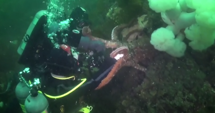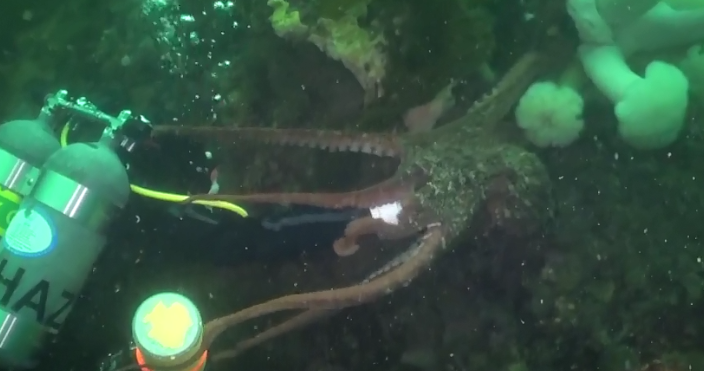 Dennis along with Shaz and Wes came across a giant Octopus. The Giant Pacific Octopus was hiding behind the rocks. This giant octopus weighs around 110 pounds and has a 16-foot span.