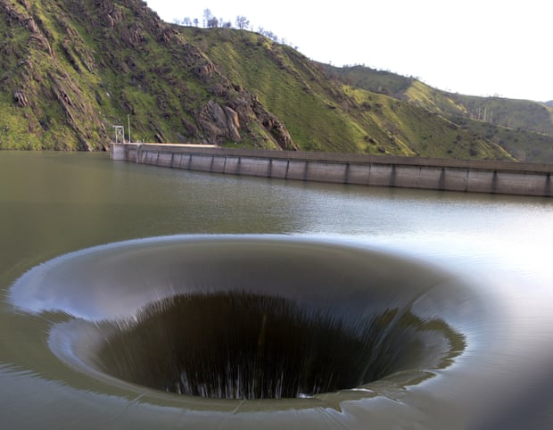 A giant ‘glory hole’ was caught on camera sucking in rainwater overflow with ease after a set of massive storms took over the sky in Northern California.