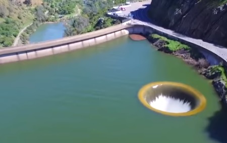 In the rare occurrence, the water level in the reservoir rose above the level of the 72-feet-diameter drain also known as the Morning Glory Spillway.