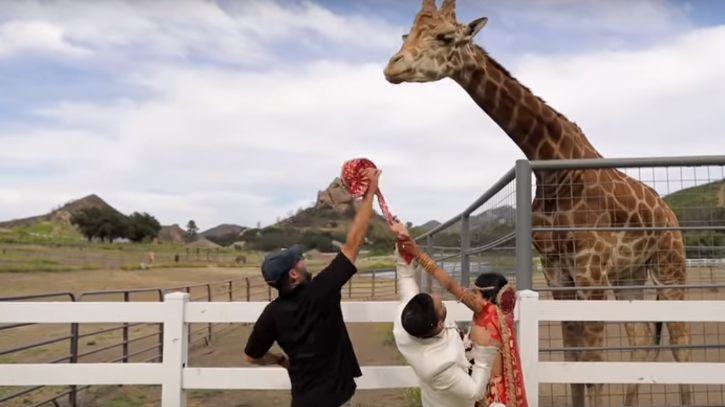 When they were getting ready for their next pose, the giraffe named Stanly leaned in and yanked the turban from the head of the groom. It even made a good attempt to chew it. The couple, along with a photographer, instantly jumped and snatched back the turban. At the end of the clip, the couple was seen laughing hysterically at the incident.