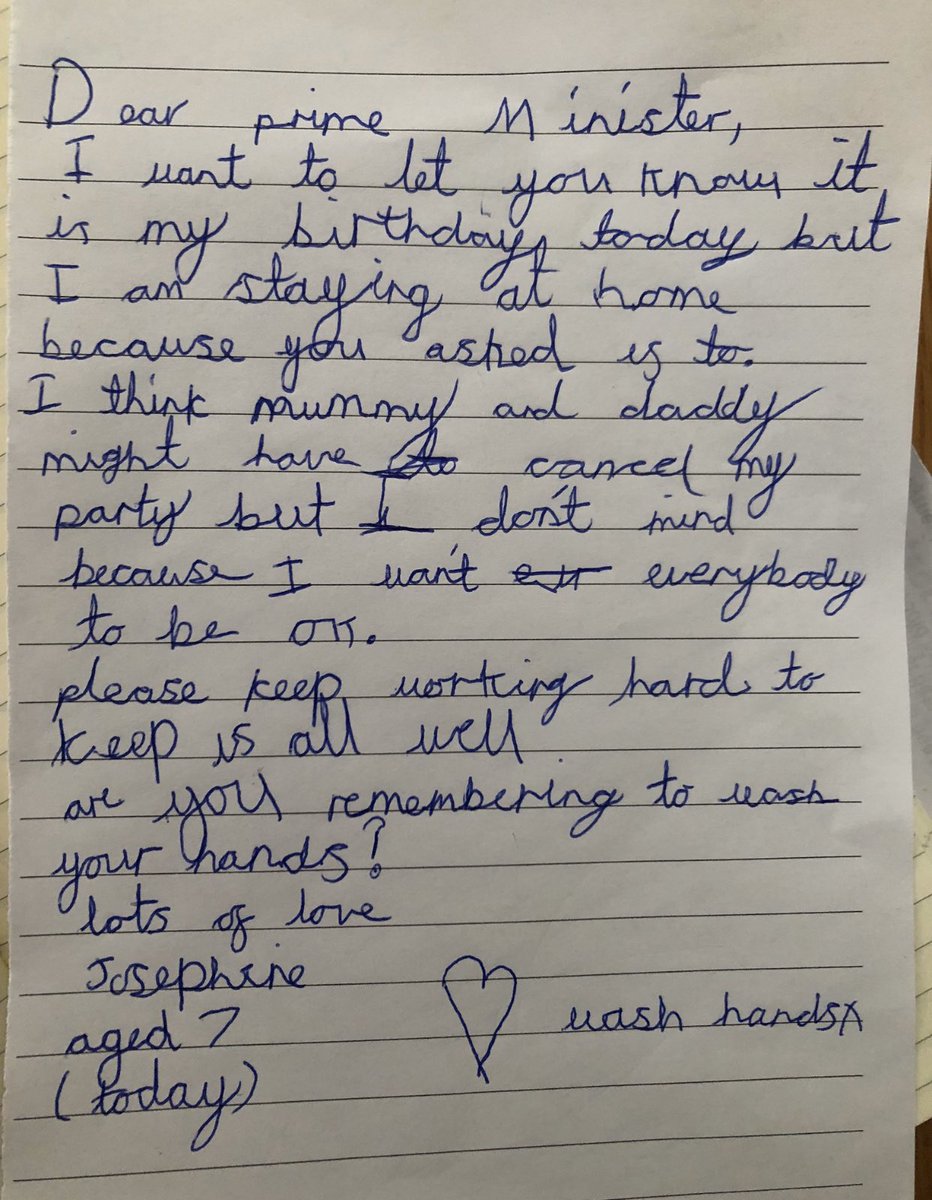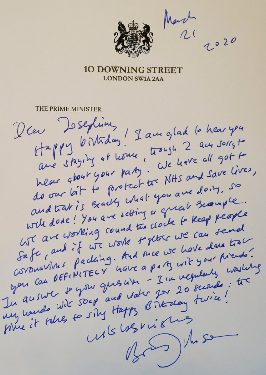 Johnson tweeted his letter and praised Josephine for setting a great example by canceling her birthday party amid coronavirus crisis.