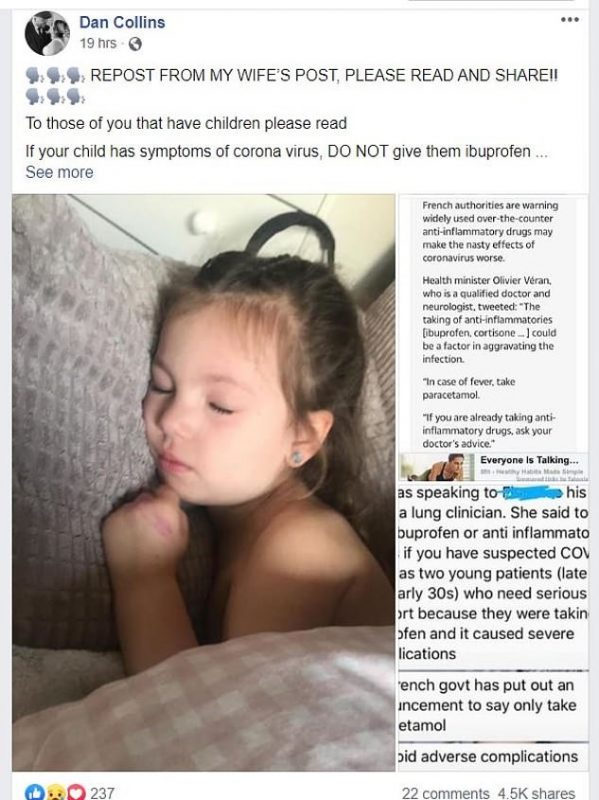 Mr. Collins, Amelia’s stepdad, shared Amelia’s photo on Facebook and warned: “If your child has symptoms of coronavirus, DO NOT give them ibuprofen.”