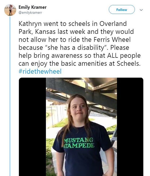 “Kathryn went to Scheels in Overland Park, Kansas, last week and they would not allow her to ride the Ferris Wheel because ‘she has a disability,’” Emily wrote.