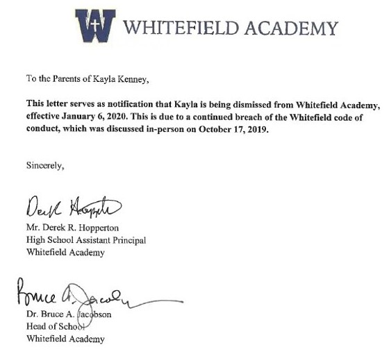 Just days after her mum posted birthday photos on Facebook, Kayla received a letter informing her that she’d been dismissed from Whitefield Academy due to “continued breach” of their “code of conduct.”