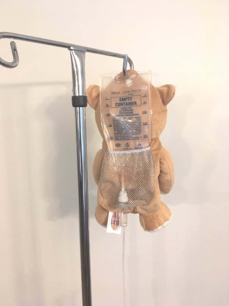 This teddy was made by stuffing animals and a hot glue gun to make a non-threatening IV contraption.