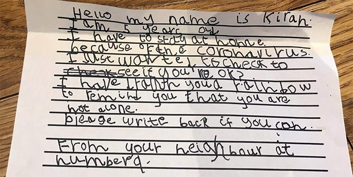 The kindhearted little girl wrote: “Hello, my name is Kirah. I am 5-years-old and I have to stay at home because of the coronavirus. I just wanted to check to see if you’re ok? I have drawn you a rainbow to remind you that you are not alone. Please write back if you can. From your neighbor at number 9.”