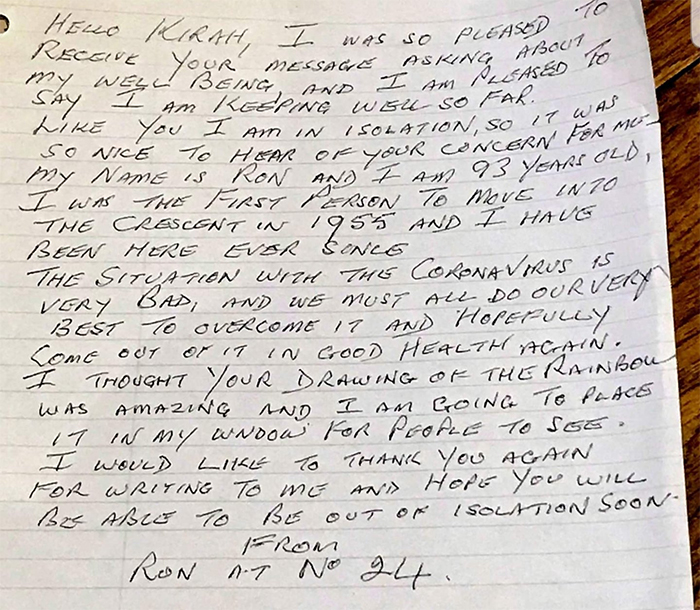 “I thought your drawing of the rainbow was amazing and I am going to place it in my window for people to see. I would like to thank you again for writing to me and hope you will be able to be out of isolation soon. From Ron at no 24.”