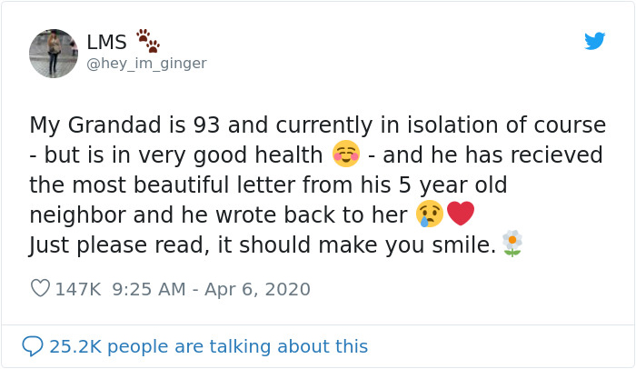 It was 22-year-old teacher Louisa May who shared the heartwarming story on Twitter. “My grandad is 93 and currently in isolation of course – but is in very good health – and he has received the most beautiful letter from his 5 year old neighbor and he wrote back to her.