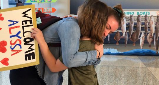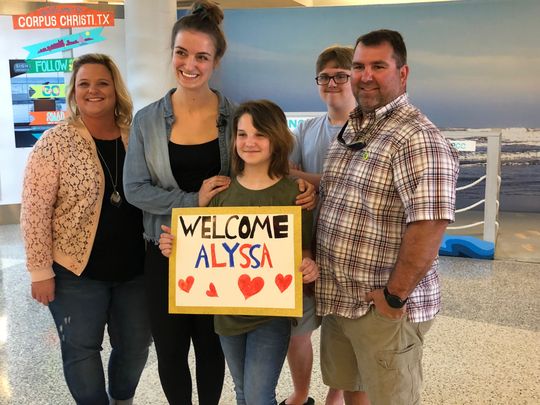 Laynie Houser held a sign that read “Welcome Alyssa” as she joined with her parents and brother at the Corpus Christi airport.